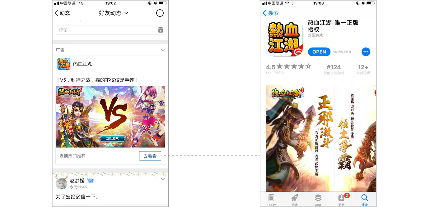 首先,以提高游戏知名度与下载量为目标,龙图游戏基于自身数据资源、全面分析现有用户属性,筛选目标人群标签。借助腾讯社交广告人群定向能力,龙图游戏最终选定玩家群体较集中、付费行为更普遍的15-45岁男性用户为目标人群,并选定与游戏风格相符的角色扮演和PK竞技类APP行为标签。同时,龙图游戏用游戏画报,人物装备、技能图片等多样图片作为广告素材,广泛吸引目标用户注意,提升其旗下游戏的知名度,带动用户下载。