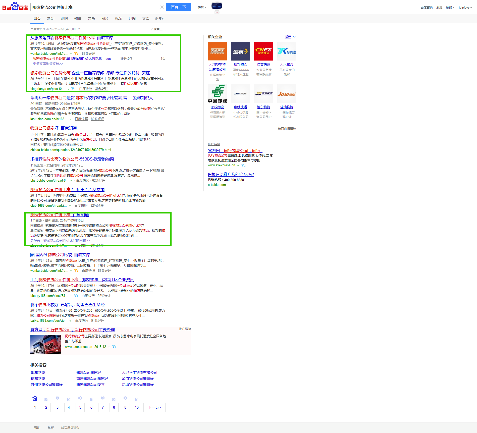 而在10个行业词中,也达成了较好的品牌推广效果,例如搜索关键词“哪家物流公司性价比高”,在百度搜索首页中展现了4条关于德邦物流的正面信息,内容为百度文库、博客、百度知道。