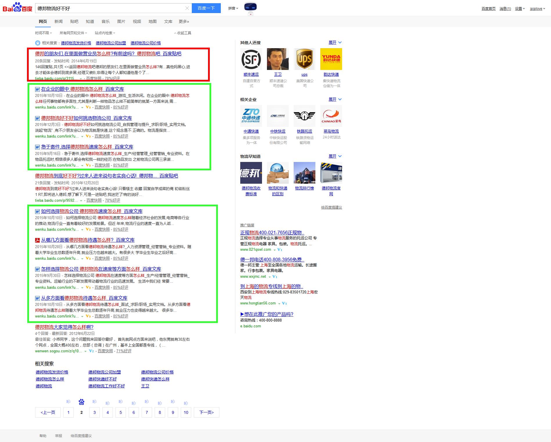 11个品牌词百度前两页负面均低于80%,例如“德邦物流好不好”,在百度相关信息搜索中占据7条正面信息,内容为百度文库,远大于负面的信息量。