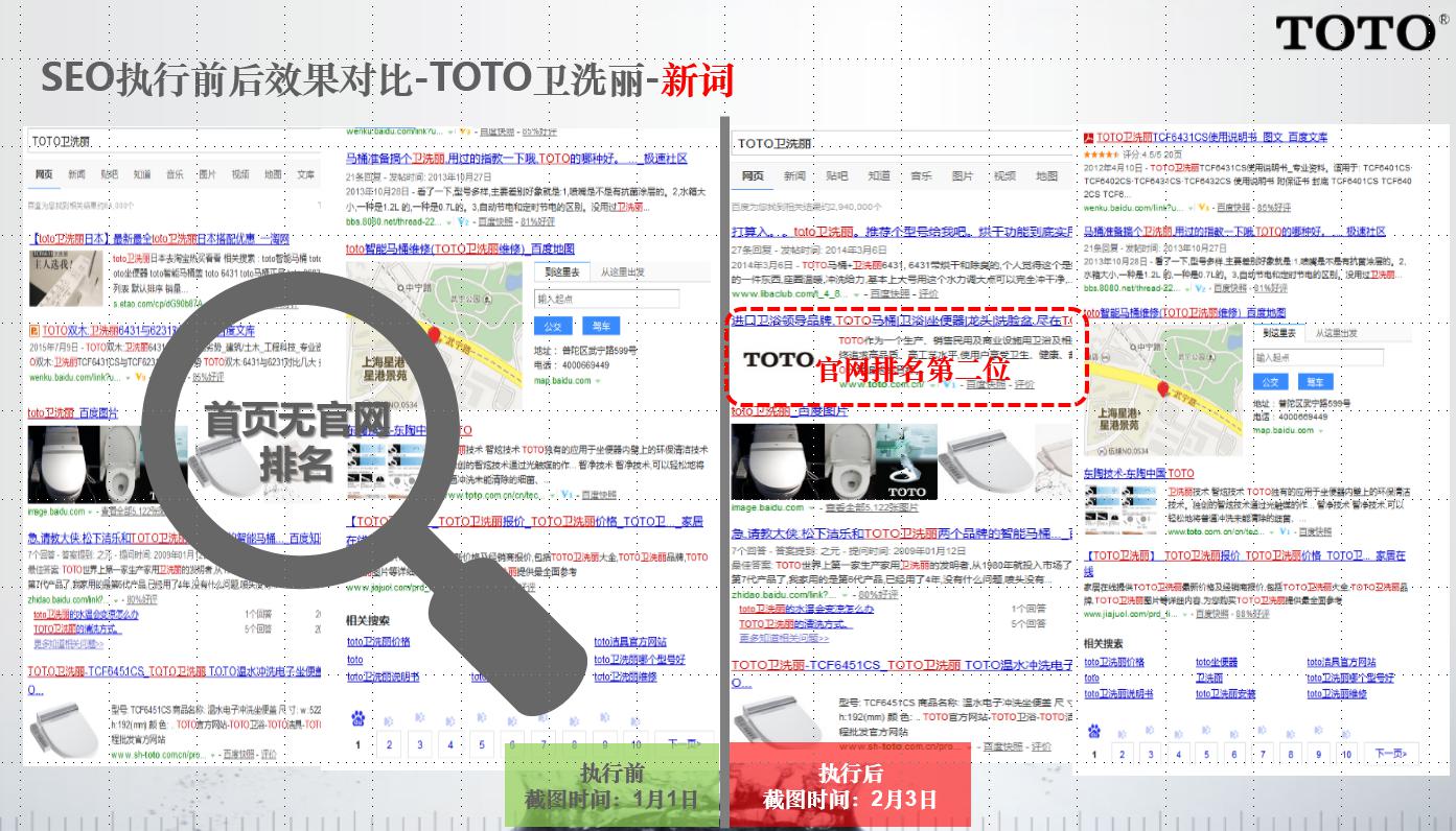 以关键词“TOTO卫洗丽”为例,执行前官网无排名,执行后官网位于百度首页第二名。