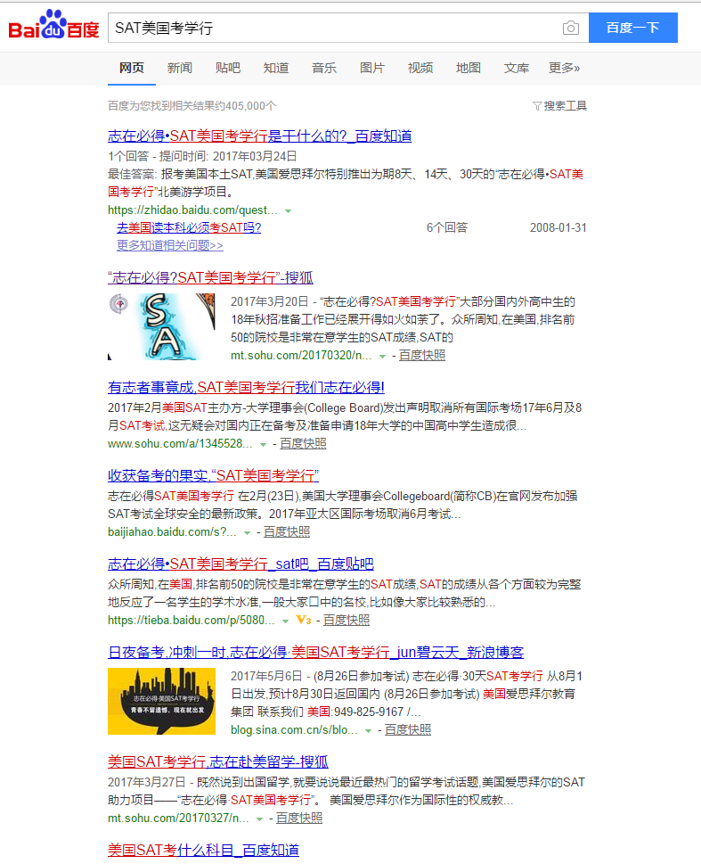 3、 肆行传媒另外利用百度平台、BBS论坛、门户博客、信息平台等多渠道,根据关键词为美国爱思拜尔推出的SAT美国考学行项目具备更良好的口碑和知名度,权威性。
