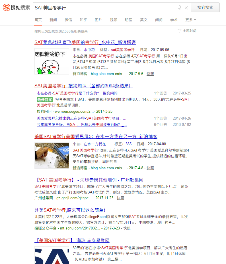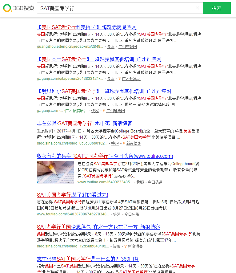 经过两个月的大力推广,SAT美国考学行项目在各个搜索引擎占尽了所有搜索结果,口碑得到了大大的提高!